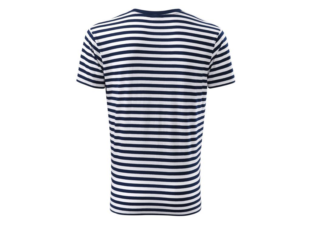 Tričko zdobí typické vodorovné pruhy v kombinaci bílé a námořní modré, které evokují letní atmosféru a dodávají outfitu šmrnc. Střih s bočními švy zajišťuje skvělé padnutí na postavě a zachování tvaru i po mnoha praních. K celkové odolnosti přispívá také zpevnění ramenních švů páskou, které prodlužuje životnost oděvu.