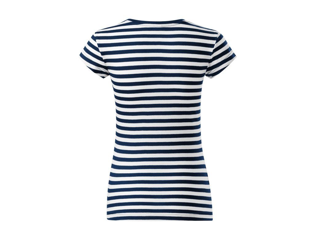 Dámské tričko s krátkým rukávem přinášející svěží námořnický styl v moderním a pohodlném provedení. Tričko je vyrobeno z příjemného Single Jersey úpletu ze 100 % bavlny, který je hebký na dotek, prodyšný a ideální pro každodenní nošení. Design tvoří klasické vodorovné pruhy v kombinaci bílé a námořní modré.