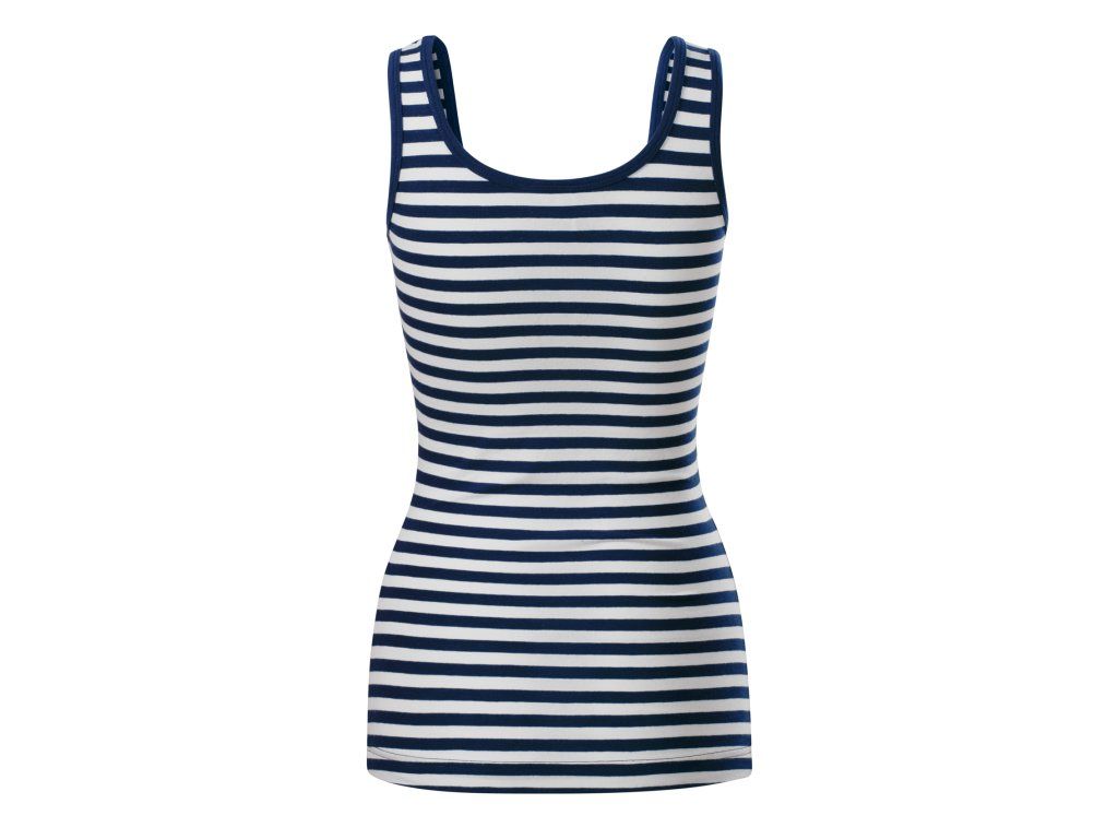 Dámské tílko představující svěží letní kousek v oblíbeném námořnickém stylu, který kombinuje pohodlí, eleganci a skvělé padnutí. Charakteristické pruhy v bílé a námořní modré barvě dodávají outfitu lehkost a dovolenkový nádech, zatímco střih a materiál zaručují, že se v něm budete cítit skvěle po celý den.