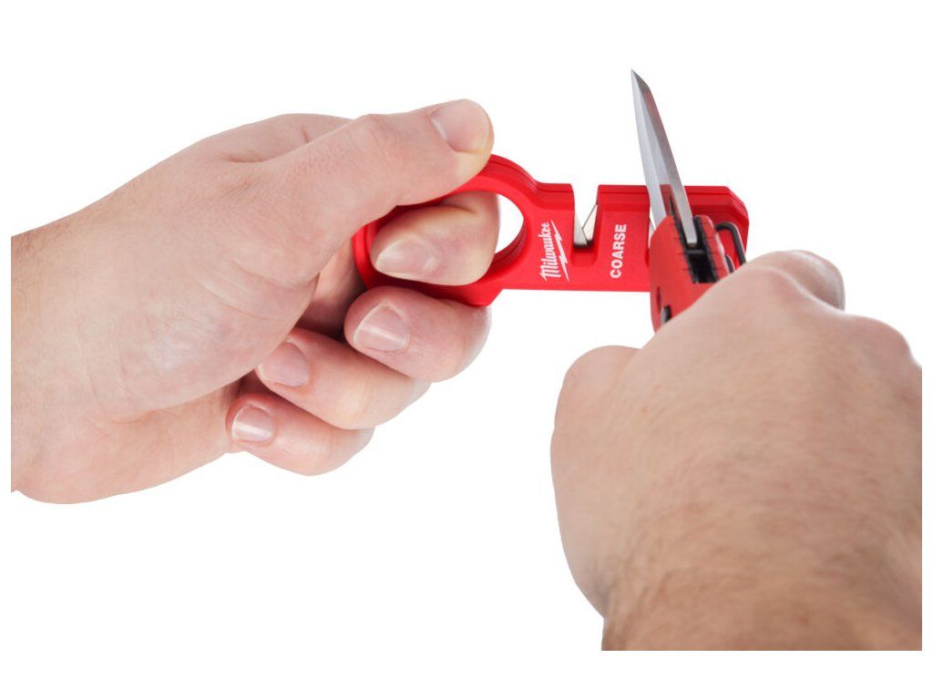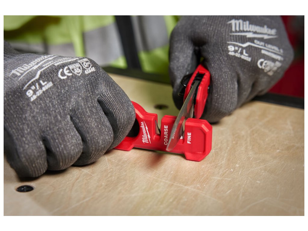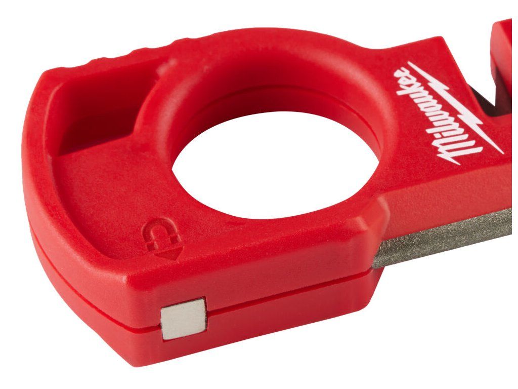 Pro zvýšení praktičnosti je brousek vybaven vysokokontrastními značkami na přední i zadní straně, které usnadňují čitelnost. Díky otvoru na lanko lze brousek snadno připojit k bezpečnostnímu vybavení Milwaukee, což umožňuje bezpečné používání i ve výškách.