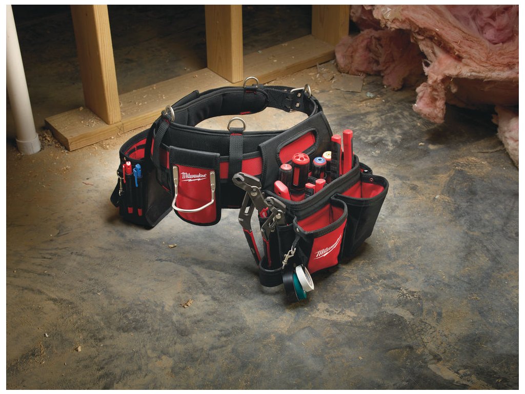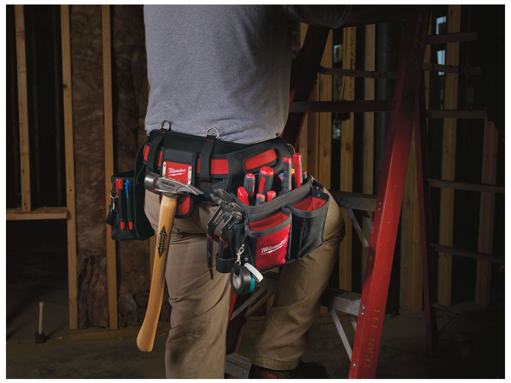 Pro maximální pohodlí při celodenním nošení je opasek vybaven polstrovaným a prodyšným pásem, který snižuje tlak na bedra a boky. Kovové úchyty umožňují připevnění kšand pro lepší rozložení hmotnosti, zatímco kovový klip na svinovací metr zajišťuje jeho bezpečné uložení s rychlým přístupem při práci.