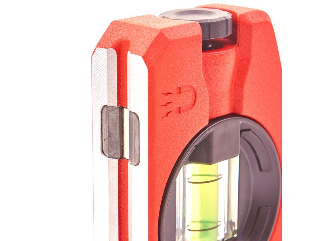 Vodováha dále disponuje V-drážkou pro přesné zarovnání na kulaté trubky, silnými magnety pro přichycení k feromagnetickým povrchům a také frézovaným okrajem, který podporuje přesnost měření. Díky svému kompaktnímu provedení je ideální volbou pro profesionály, kteří ocení kombinaci mobility a výkonu.
