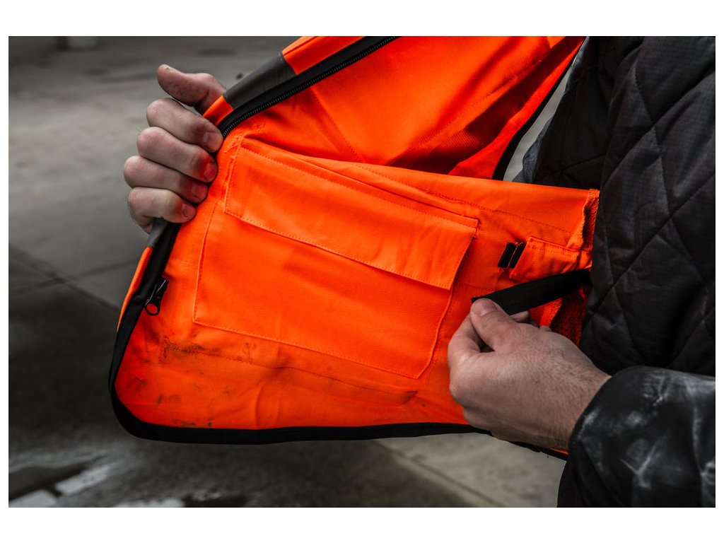 Reflexní vesta poskytující uživateli vysokou viditelnost s polstrovaným límcem pro zvýšené pohodlí, 15 kapsami k nošení většího počtu předmětů a průhlednou přihrádkou na průkaz.