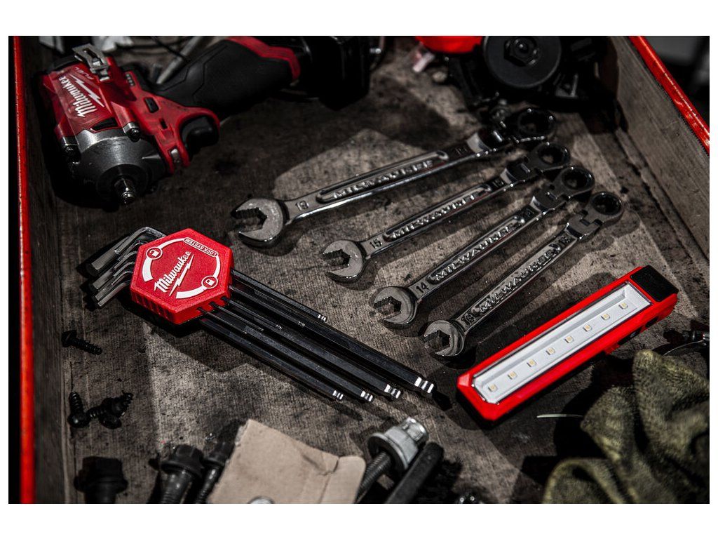 Velikost jednotlivých klíčů je výrazně označena pro okamžité rozpoznání potřebné velikosti bez zdlouhavého hledání. Držák obsahuje otvor pro závěs nářadí, takže je možné připojit klíče ke kompatibilnímu bezpečnostnímu závěsu Milwaukee a používat je komfortně i ve výškách. Díky tomu je zaručeno maximální bezpečí při práci.