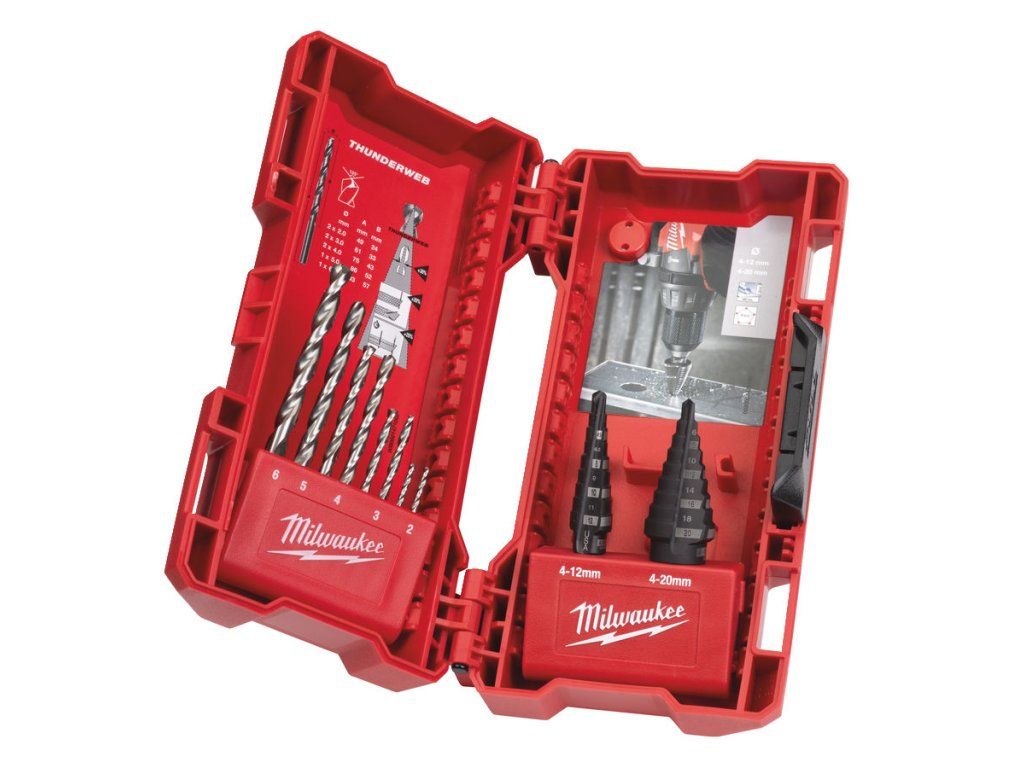 Sada obsahuje: 2× stupňovité vrtáky: 4–12 mm / 1 kus, 4–20 mm. Kovové vrtáky THUNDERWEB: 2× 2 mm, 2× 3 mm, 2× 4 mm, 1× 5 mm, 1× 6 mm.