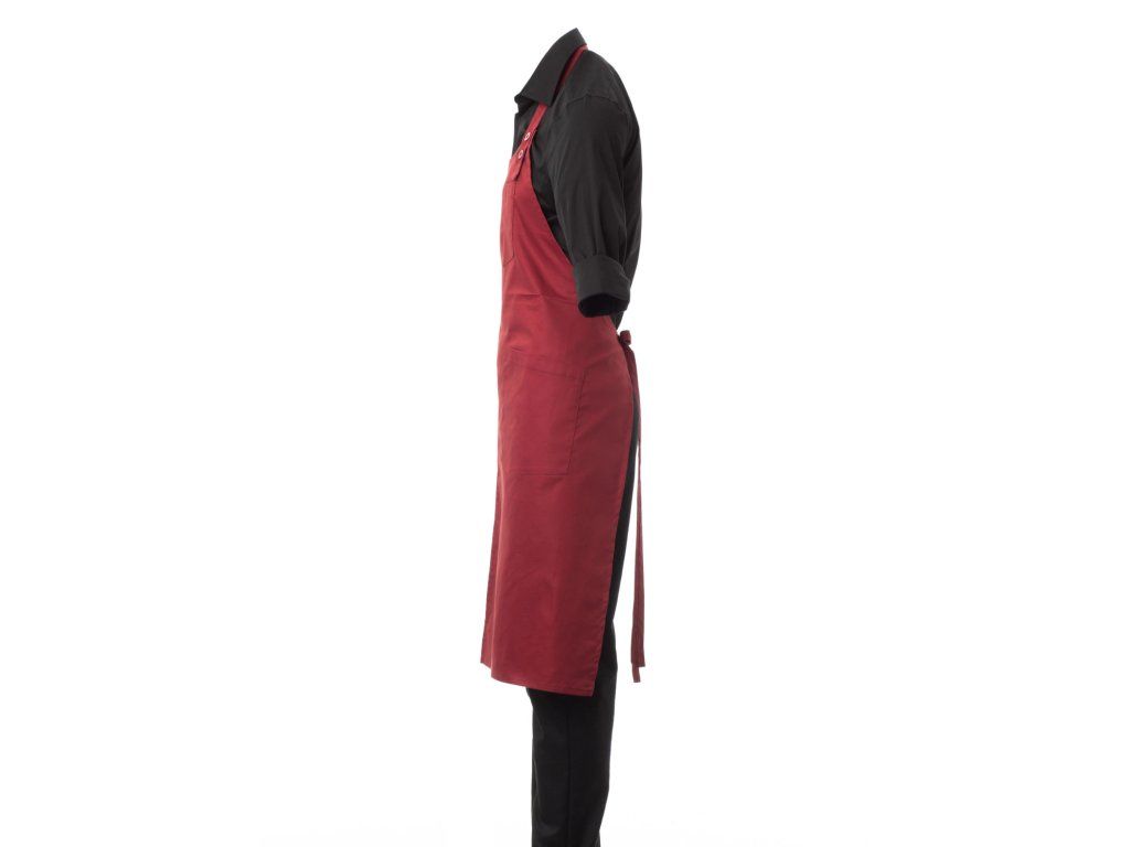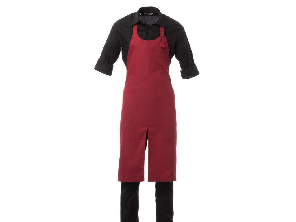 Zástěra je vybavena laclem se zaobleným výstřihem, který je nastavitelný pomocí dvou knoflíků v přední části, což umožňuje přizpůsobení podle individuálních potřeb uživatele, a také středovým rozparkem, který usnadňuje pohyb, což ocení číšníci, kuchaři i baristé při aktivní práci.